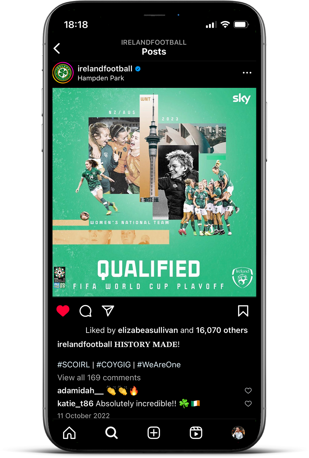 I had the incredible opportunity to create the ‘Qualified’ graphic for the Ireland Women's National Team when they secured their historic spot at the FIFA Women's World Cup in Australia. Seeing my work play a role in celebrating such a landmark achievement was an unforgettable experience. This project showcased my ability to capture the excitement of a moment through design, ensuring the visual resonated with both the team and its supporters.