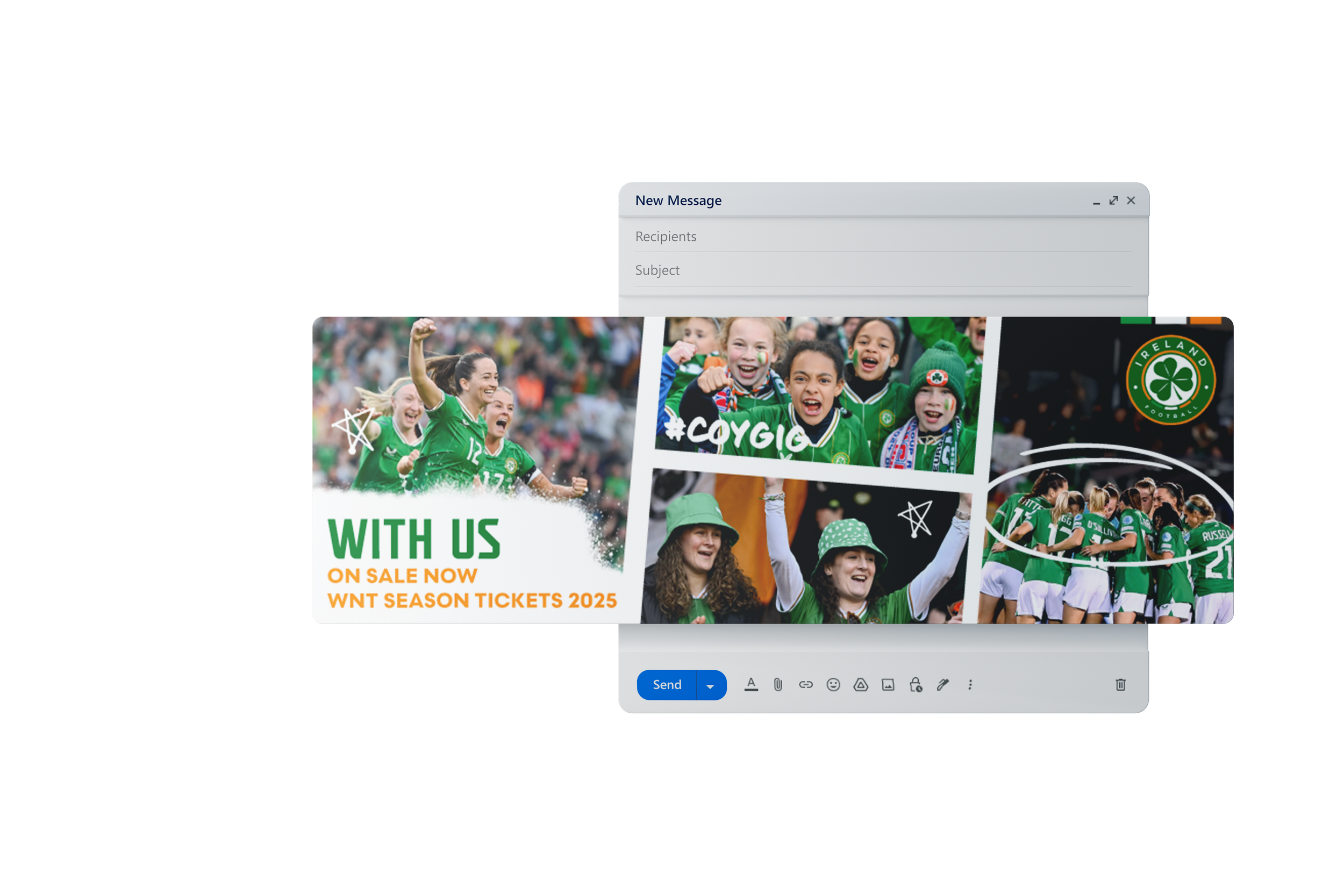 The use of green as the dominant colour in the collage images aligns with the national team’s identity, complemented by the Ireland Football crest and the Irish flag, maintaining brand consistency.